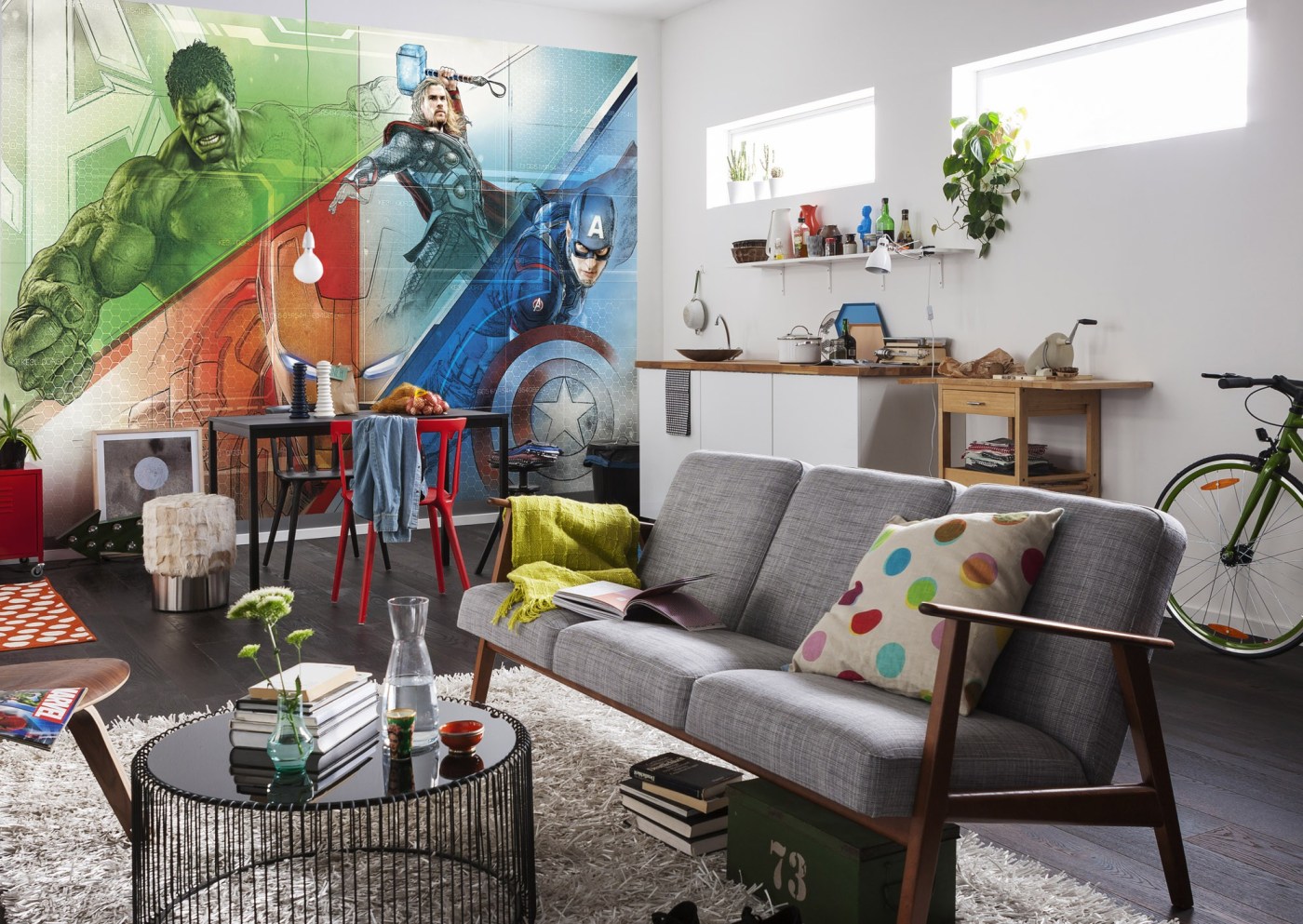 Aqui com Capitão América, viúva Negra, Thor e Hulk numa das mais famosas cenas dos Vingadores. Encomenda o teu mural aqui!