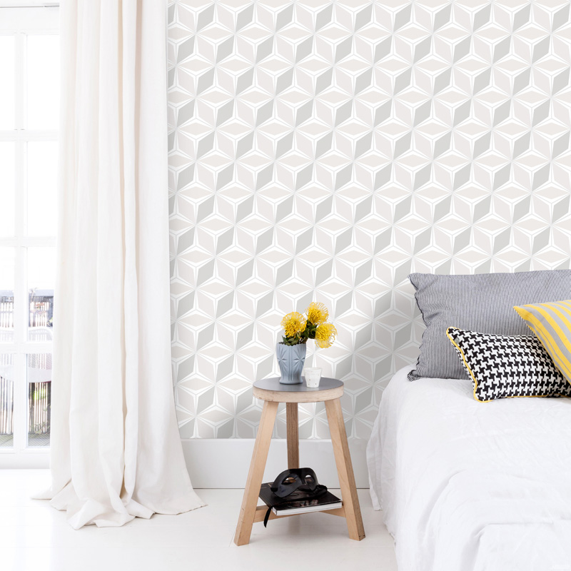 Um papel de parede geométrico, muito procurado pelo seu efeito 3D. As cores são neutras e pode aplicar num quarto com uma mobilia de design minimalista e uma decoração simples, tal como se vê na imagem. Referência 68634