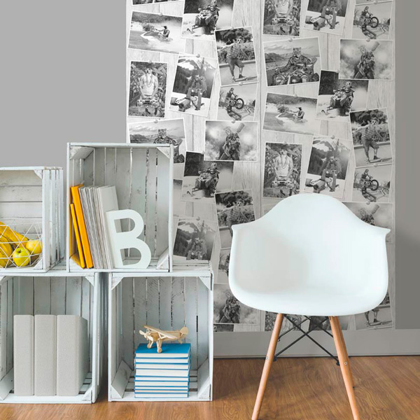 Uma colecção de papel de parede juvenil na sua essência, mas com muitos motivos que agradam a todos. Muitas referências á decoração informal, com as típicas colagens de fotos e recortes de jornal, nas paredes. Muitas referências a ícones da cultura Pop, como estrelas de rock, o universo E.U.A nos anos 80-90, com grafitis e parede de tijolo, recortes de banda desenhada, carrinha “pão de forma” da volkswagen, entre outros.
