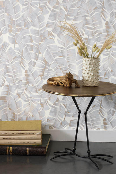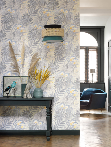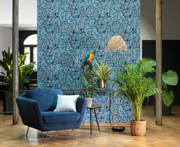 Continuamos com a apresentação da Coleção de papéis de parede Botanica e a grande variedade de estampas e cores que marcam e diferenciam a decoração de paredes. Na foto acima o destaque do azul no papel de parede com folhas de palmeiras estilo tropical e detalhes em dourado tem um presença decorativa que muda o ambiente e acrescenta beleza e estilo na decoração. Este papel de parede botanica folhas tropicais, está disponìvel em nossa página online em 06 tonalidades. Acesse agora mesmo e confira!