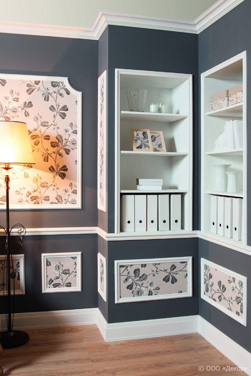 As rosetas de teto utilizadas como ornamentação da parede na foto acima combinando com a mesma cor da pintura e complementando a decoração uma iluminação amarela que diferencia e dá um toque mais vívido as paredes. Mais uma vez a criatividade é o grande diferencial para criar ou renovar ambiente da casa ou do escritório. Acesse nossa loja online e conheça nossa variedade de produtos para decorar! Além das rosetas e molduras decorativas temos papel de parede para composição do boiserie, vinis autoadesivos, fotomurais, mapas para parede, productos personalizados e ferramentas para a instalação de papéis, murais e molduras. Confira hoje mesmo as opções de nossa loja online.