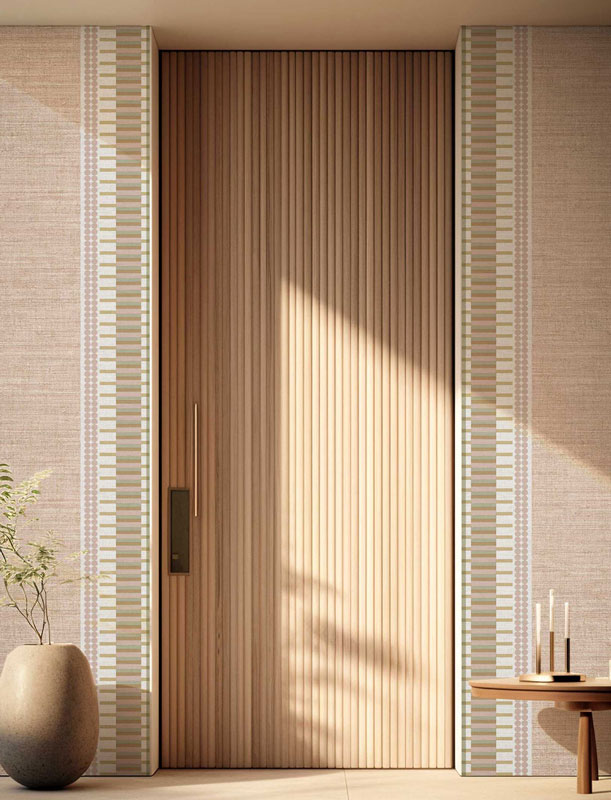 As faixas de parede podem ser colocadas, no meio da parede, ao redor da porta ou perto do teto para criar um efeito de moldura como na foto do interior acima. Escolha faixas decorativas com padrões geométricos que complementem o estilo do ambiente. Padrões mais simples são ideais para decorações minimalistas, enquanto padrões mais complexos podem ser usados em decorações modernas ou ecléticas. Seja qual for seu estilo, a decoração com papéis de parede texturas e com faixas decorativas texturizadas da loja papel pintado online é uma das opções mais indicadas para quem busca um ambiente diferenciado, elegante e lindo!