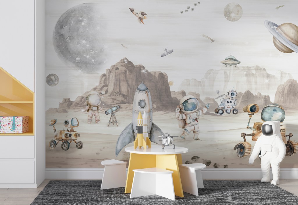 Opte por móveis que complementem o tema, veja este interior decorado com painel infantil Astronautas, a mesinha e cadeiras circulares ou em formato meia lua, luminárias e enfeites com a temática espacial, móveis modernos, cores claras com detalhes mais coloridos e poderá por exemplo incluir as camas em formato de foguete e outros detalhes que adicionam um toque divertido e diferenciado para o ambiente dos pequenos.