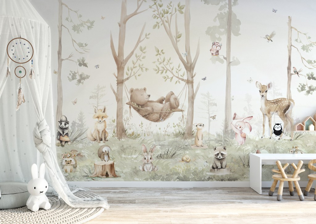 Uma proposta para decorar as paredes do quarto infantil que se destaca pelos desenhos detalhados dos animais do bosque e a vegetação que envolve e harmoniza o desenho.