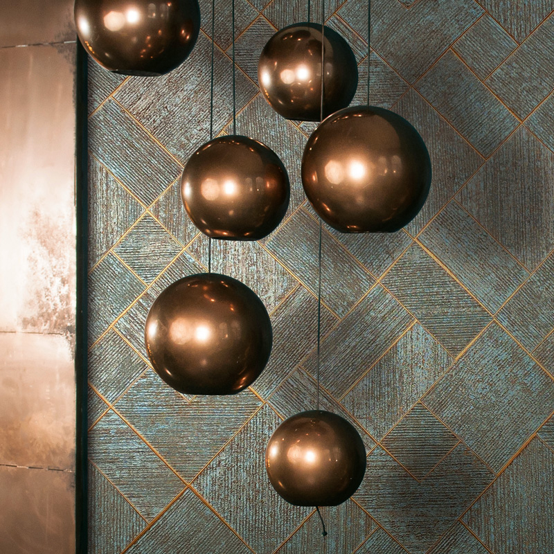 Designs geométricos com acabamentos metálicos e texturizados adicionam um toque de luxo e modernidade, transformando pequenos espaços em áreas de destaque como o lavabo, na foto o papel de parede mosaico textura e metalizado é uma obra de arte na parede.
