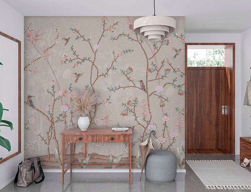 Nas fotos acima apresentamos o painel folhagens verdes sombreadas e o mural chinoiserie com galhos e pássaros, duas ideias de decoração para hall de entrada com painéis encantadores.
