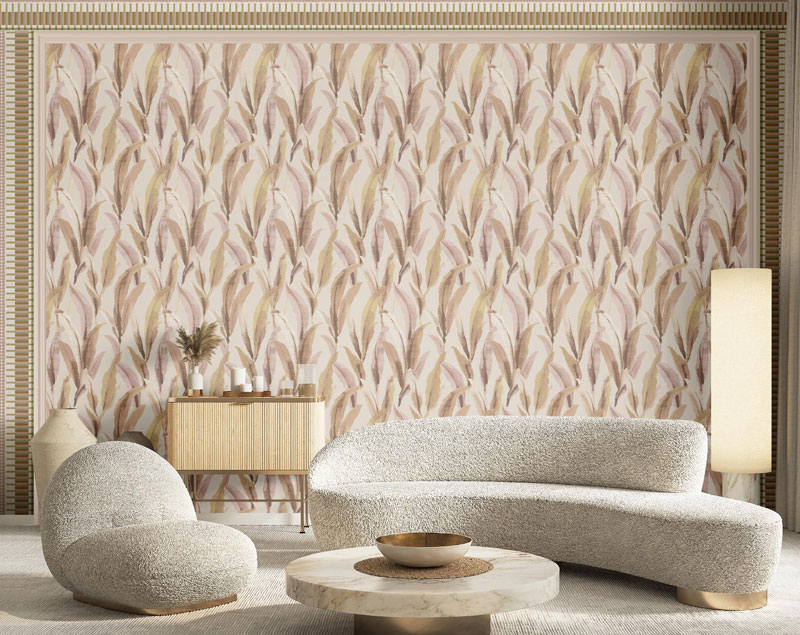 Crie um ambiente marcante e elegante decorando com papel de parede com destacando uma só parede que será a protagonista da decoração, nesta sala de estar da foto utilizamos um papel de parede alta gramagem com desenho de folhas texturizadas da coleção Italiana Bálamo em composição com a faixa decorativa texturizada da mesma coleção que tem um efeito de moldura na parede, o sofá e luminária moderna com o boucle chair complementam a decoração impecável deste ambiente que será onde se reunirão seus convidados e familiares.