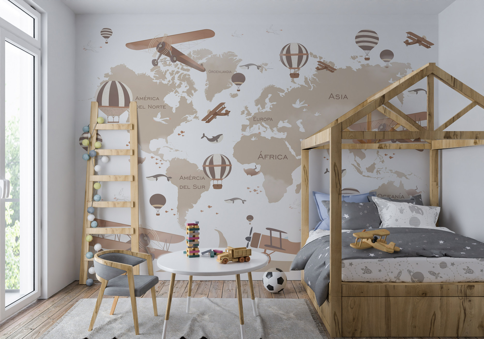 Para combinar com os papéis de parede infantis da loja papel pintado online, a escolha dos móveis infantis também faz a diferença na decoração do quarto. O móveis de madeira, o rattan, o bambu e o lino são materiais que continuam em alta na decoração infantil. Esses materiais trazem aconchego e autenticidade ao ambiente. Ao combinar esses elementos com os papéis de parede da coleção “Once Upon a Time 2”, é possível criar um quarto infantil que seja ao mesmo tempo moderno e acolhedor, veja abaixo ideias de móveis infantis e papéis de parede combinados: