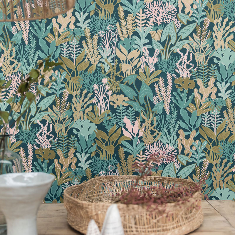 O desenho de algas e corais no papel promove uma decoração interior com suavidade e pode ser complementado com móveis rústicos de madeira, adornos com temas marinhos como vasos e conchas de cerâmica, escultura de peixe e adornos que estejam em sintonia com a estampa de corais marinhos.