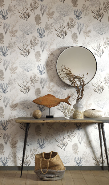 O desenho de algas e corais no papel promove uma decoração interior com suavidade e pode ser complementado com móveis rústicos de madeira, adornos com temas marinhos como vasos e conchas de cerâmica, escultura de peixe e adornos que estejam em sintonia com a estampa de corais marinhos.