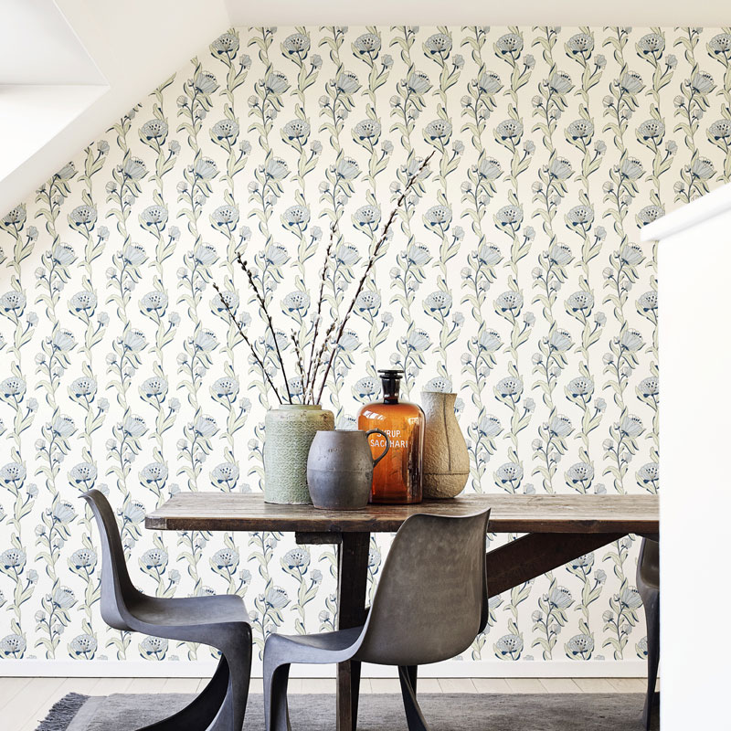 Se deseja decorar e modificar o visual da copa, sala de jantar ou aquela parede do espaço gourmet e não sabe o que fazer em papel pintado online temos a solução! Decorar com papel de parede é uma excelente opção para reformar com rapidez, qualidade e bom gosto. Na foto acima a parede da sal de jantar ganhou mais luminosidade e beleza com o papel de parede nórdico floral azul sem sobrecarregar o ambiente, conheça esta nova coleção de papel de parede clicando a seguir: Papel de parede Coleção Living Home de Fiona.