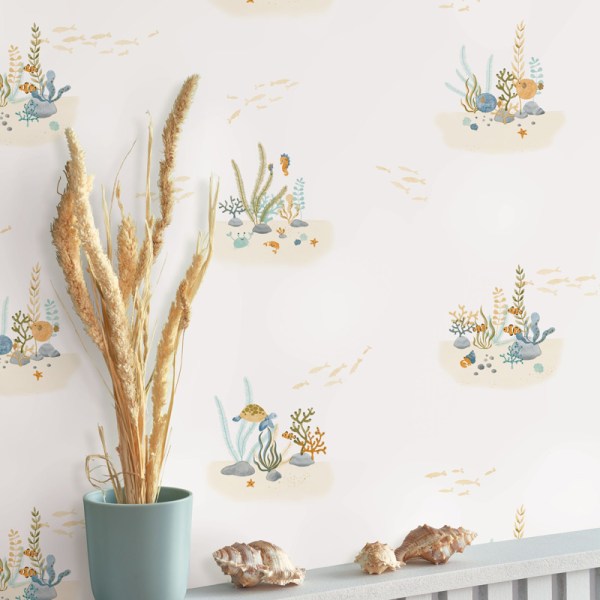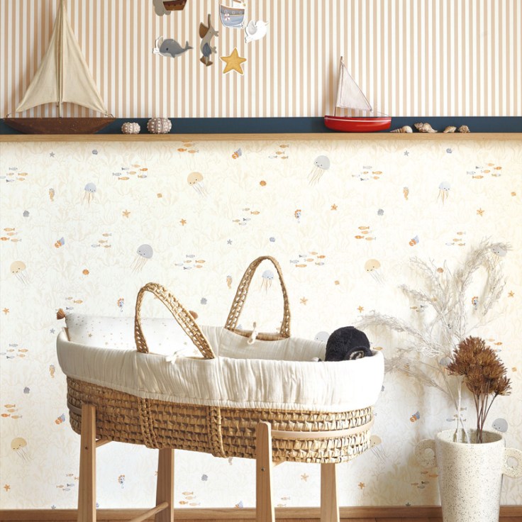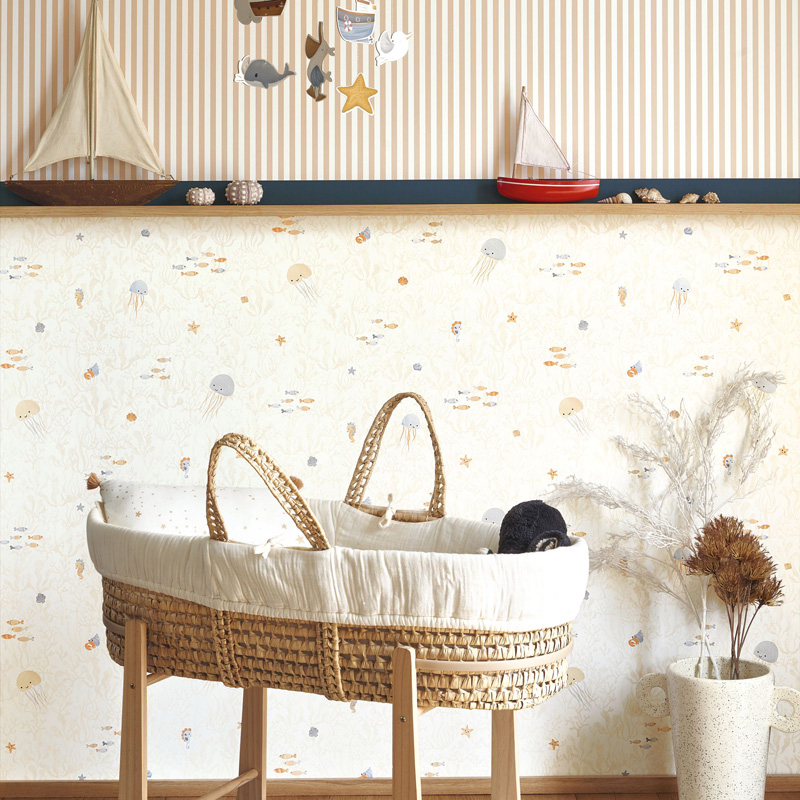 O fundo do mar é uma aposta de muito sucesso nas decorações infantis. Este desenho com referências do fundo do mar apresenta peixes, algas, corais, caravelas e o especial cavalo marinho em um cenário de harmonia e tranquilidade nas água. As cores suaves e os detalhes encantadores criam um ambiente lúdico, encantador e relaxante para as crianças. Ideal para quartos infantis que buscam serenidade e simplicidade.