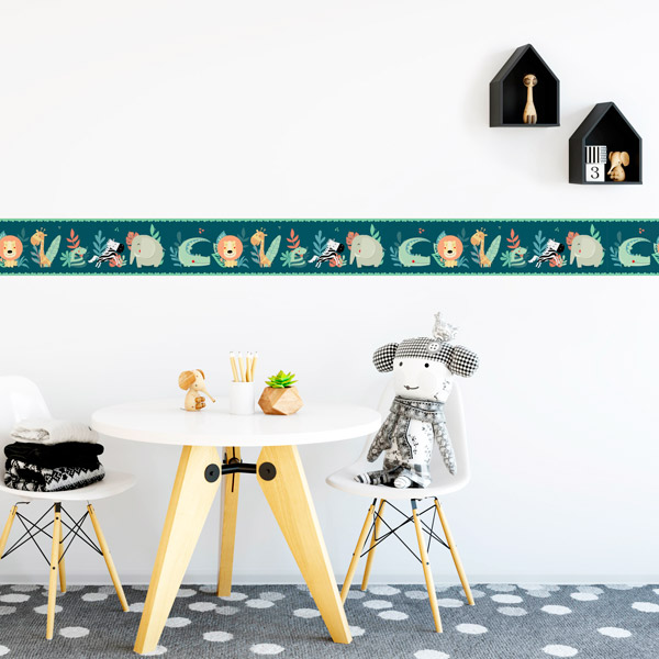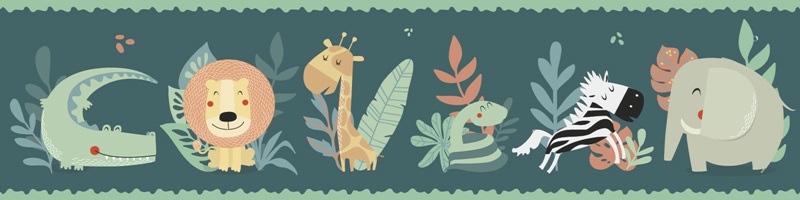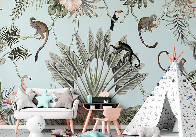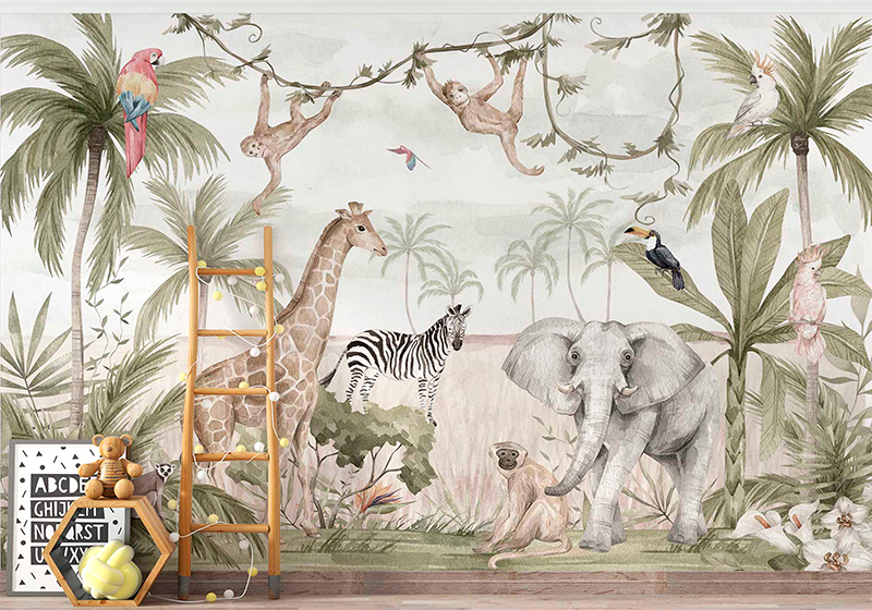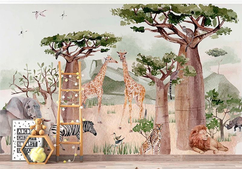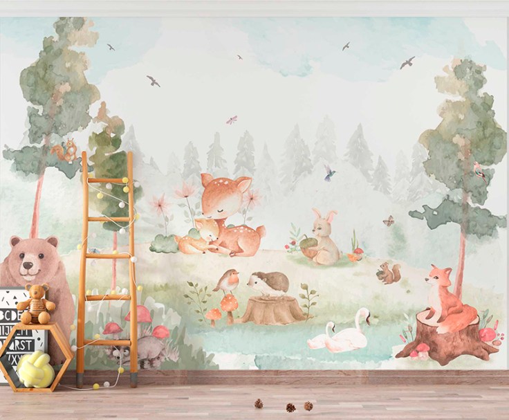 Uma proposta para decorar as paredes do quarto infantil que se destaca pelos desenhos detalhados dos animais do bosque e a vegetação que envolve e harmoniza o desenho.