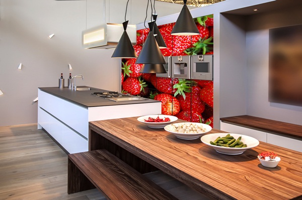 Pode fazer algumas combinações com os papéis de parede desta colecção. Na imagem pode ver como decorar a parede da zona de estar com os pratos tradicionais, e na zona do balcão de cozinha o papel que imita os azulejos tradicionais. Esta coleção permite fazer estas fantásticas combinações que dão á sua cozinha um espírito leve e único. Referências – CAV_6503_60_60 e CAV_6504_60_64