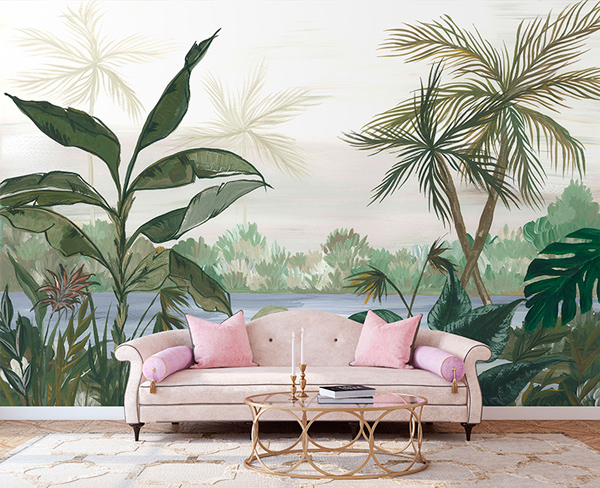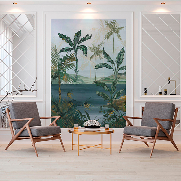 Se deseja renovar as paredes e está em busca de um produto novo e original para decorar apresentamos os painéis artísticos Chula Artist da loja online. Na foto acima uma combinação elegante, com desenhos de plantas e cores vibrantes e inspiradoras, uma pintura artística manual transformada em mural com perfeição e muito bom gosto. O mural tropical de Chula Artist é o grande destaque da sala de estar.