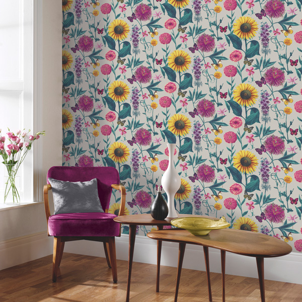 Apresentamos o papel de parede Bloom, da conceituada marca ArtHouse. Um papel de parede muito fresco, com muita e cor e que através dos motivos florais faz a ligação entre o clássico papel de parede inglês e os modernos papéis de parede florais.