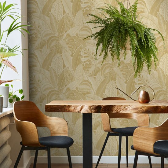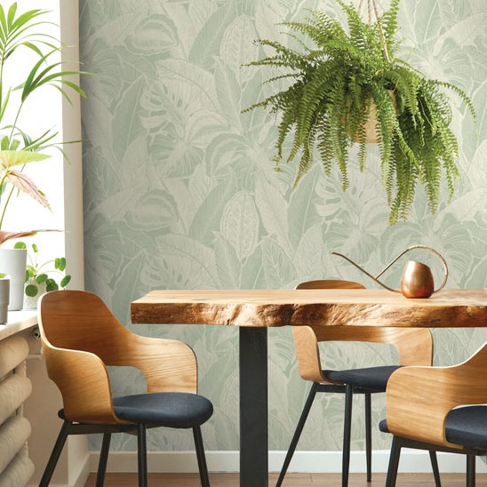 O tema natureza é tendência para decorar e está sempre na moda, e o desenho de folhas tropicais é uma das opções para renovar a parede com protagonismo e beleza, deixe sua sala de jantar com um ar mais fresco e relaxante destacando uma das paredes com este papel de alta qualidade.
