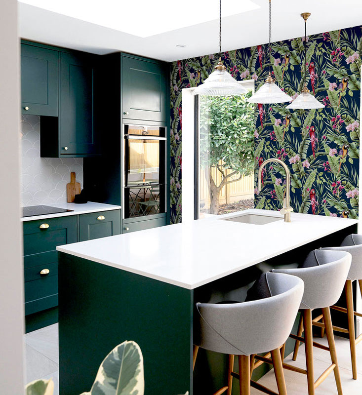 Na foto acima o papel de parede tropical jardim de araras combinando com a paleta de cores predominate verde escuro da cozinha, um show de cores da natureza para compor a decoração com os desenhos das aves exóticas que encantam por sua beleza e detalhes, acesse o link na legenda acima para conhecer detalhes deste papel de parede vinílico de 240g/m2. Esta é uma pequena amostra de tudo que papel pintado online pode oferecer para conseguir uma decoração de paredes com tema tropical sensacional e se tem qualquer dúvida ou deseja mais informações preencha o formulário abaixo que responderemos o mais breve possível.